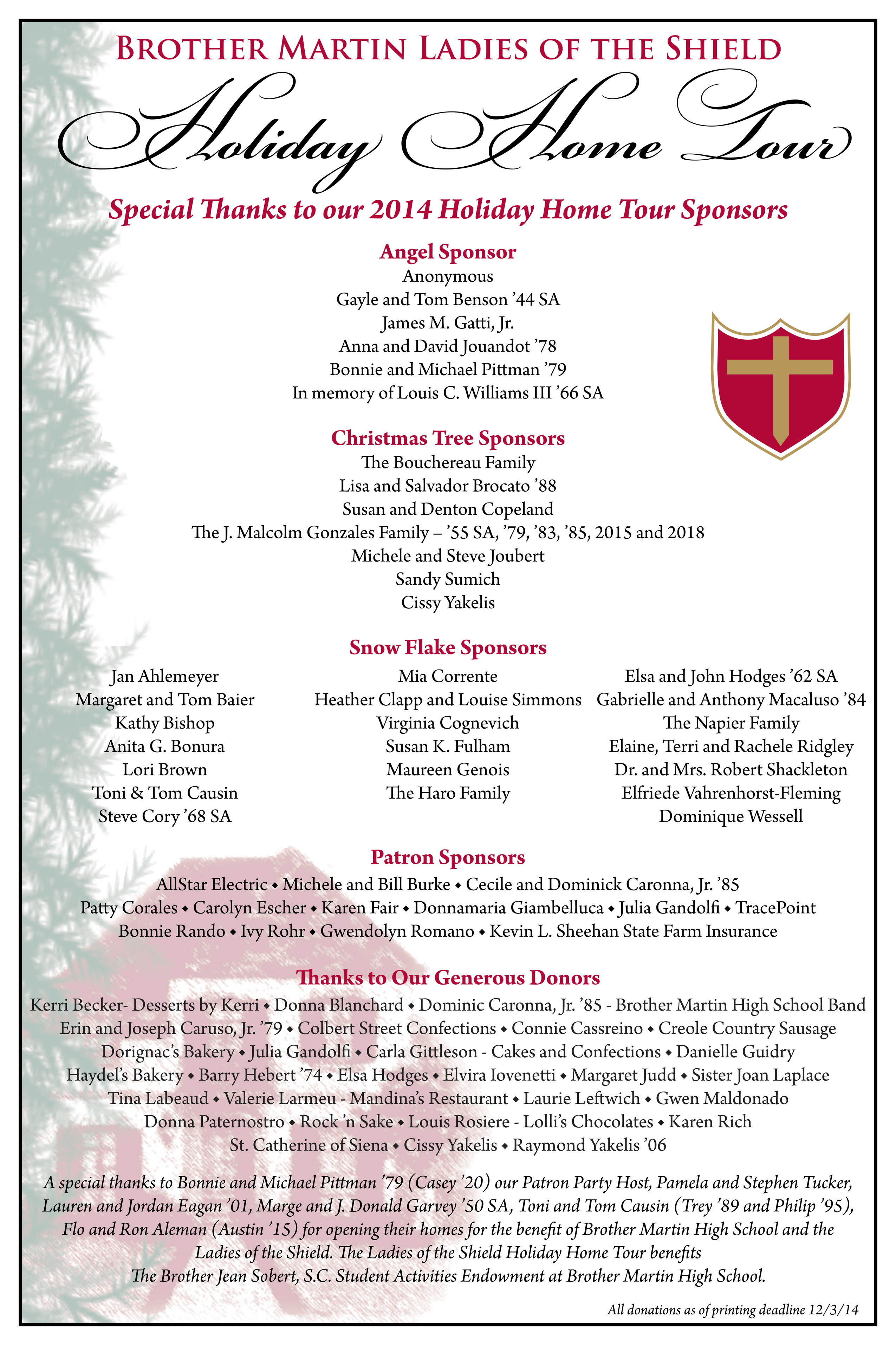On Saturday, December 6, 2014, the Ladies of the Shield and Brother Martin High School hosted its 8th annual Holiday Home Tour. This year the tour featured six (6) homes in Old Metairie. Proceeds from the tour are dedicated to the Brother Jean Sobert, S.C. Student Activities Endowment.