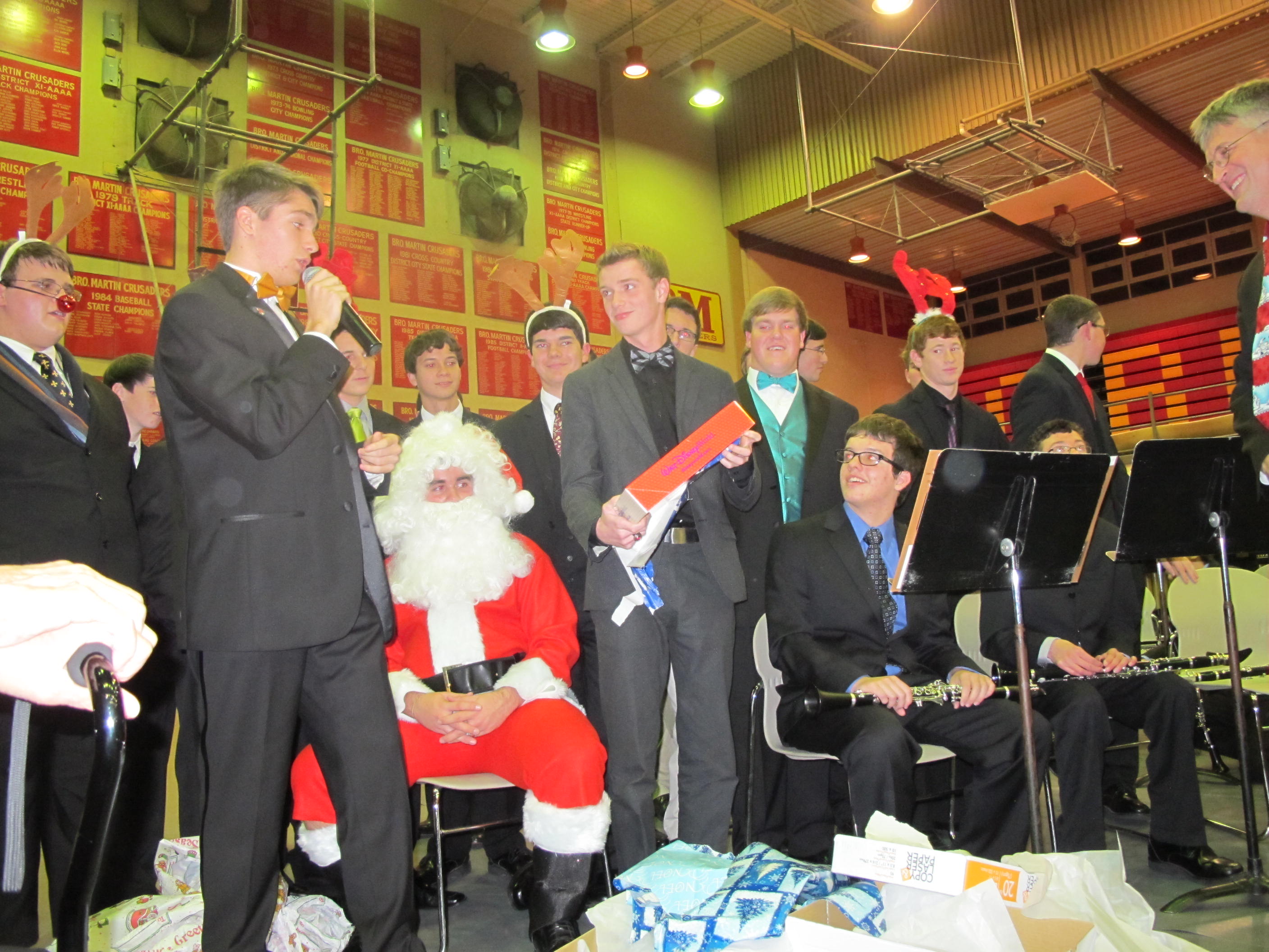 The Novice, Symphonic, and Concert Bands, under the direction of Dominick Caronna ’85 and Chris Bailey ’86, held their annual Christmas Concert this week in the Conlin Gymnasium. Beginner musicians and expert performers used their talents on a variety of holiday pieces, including David Martin’s arrangement of “Fanfare on Good King Wenceslas” and Chip Davis’s arrangement of “Veni, Veni.” Highlights of the evening included several student arrangements: senior Chris Moran arranged and performed, on drum, “Angels We Have Heard Down in Paris,” accompanied by Steven Heurtin on trumpet and Beau Bujol on flute. The entire band performed senior Brandon Gaillot’s adaptation of Michael Kamen’s theme to Robin Hood: Prince of Thieves. Congratulations, Crusader Band members, on your great holiday performance!