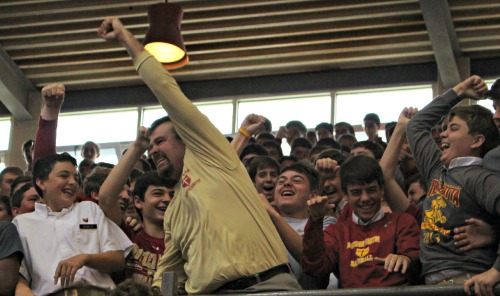 The Brother Martin community rallied together for its final pep rally of the school year. Spirits were soaring as all of the spring sports were recognized for their outstanding accomplishments throughout their seasons. The Golf team finished in the top three at the District meet, Tennis came away with 2nd place at Regionals, Track claimed its 4th straight district title, and Bowling completed a perfect season going undefeated while on their way to a District and State championship. The bowling team was introduced by head coach Mr. Bruce Himbert ’78 before presenting the trophy to Mr. Rando. The Crusader Band and Cheerleaders kept the crowd on their feet playing some of today’s current hits, and Mr. Thomas treated the crowd to a very special dance of his own. In keeping with the spring sports theme, Mr. Casadaban defeated junior Blair Frederick in a ping pong match for the coveted Student/Teacher Competition title.