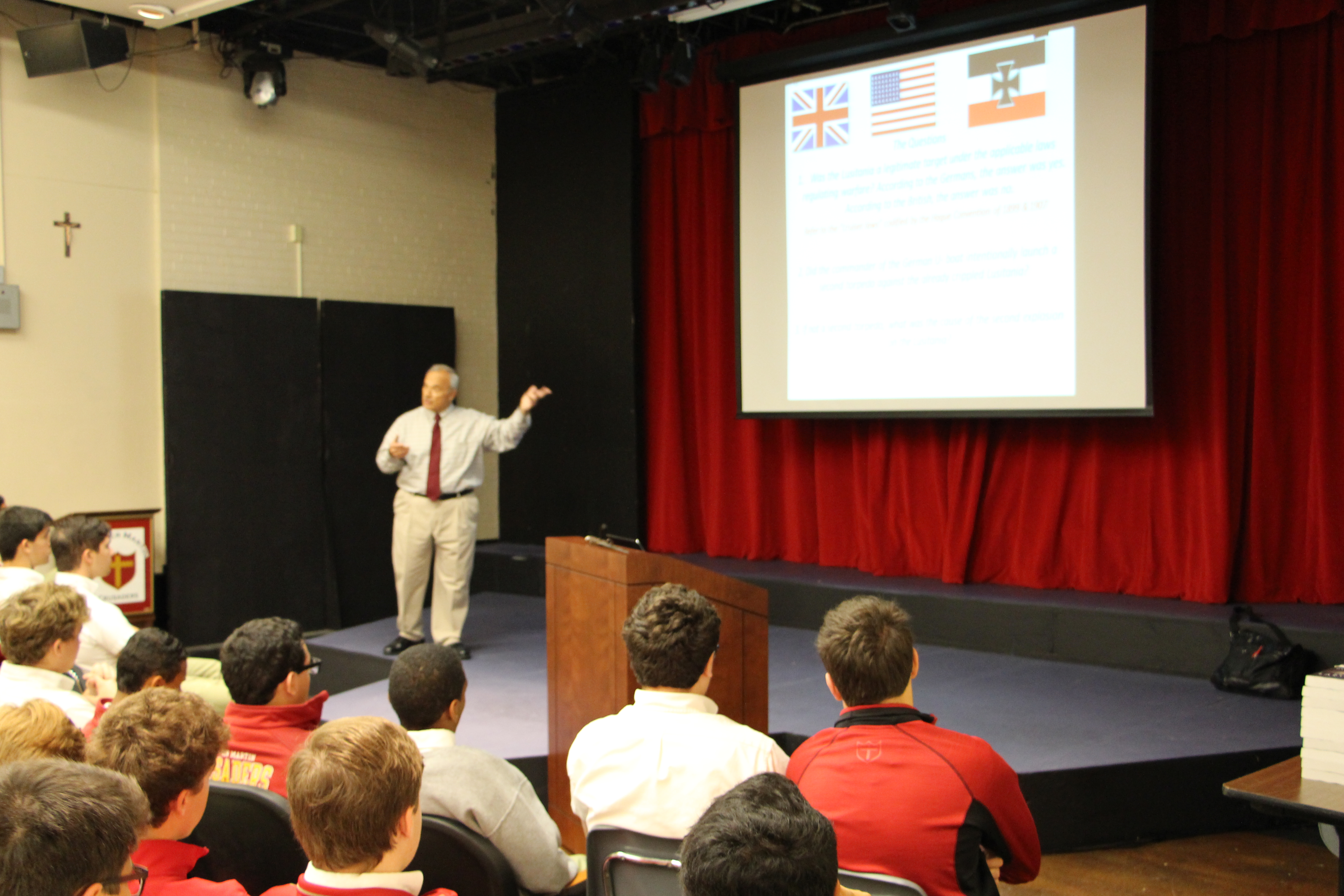 On Wednesday, November 30, the Social Studies Dept. introduced Erik Larson’s non fiction, Dead Wake: The Last Crossing of the Lusitania, to Brother Martin students and faculty. Mrs. Melanie Williams, Social Studies Department Chair, stated that “In an effort to stimulate student interest in this year’s Great Read, Mr. Fallon and Mr. Bordelon delivered a presentation to the student body about the facts of the sinking of the Lusitania as well as the conditions leading to the entrance of the United States into World War I.”