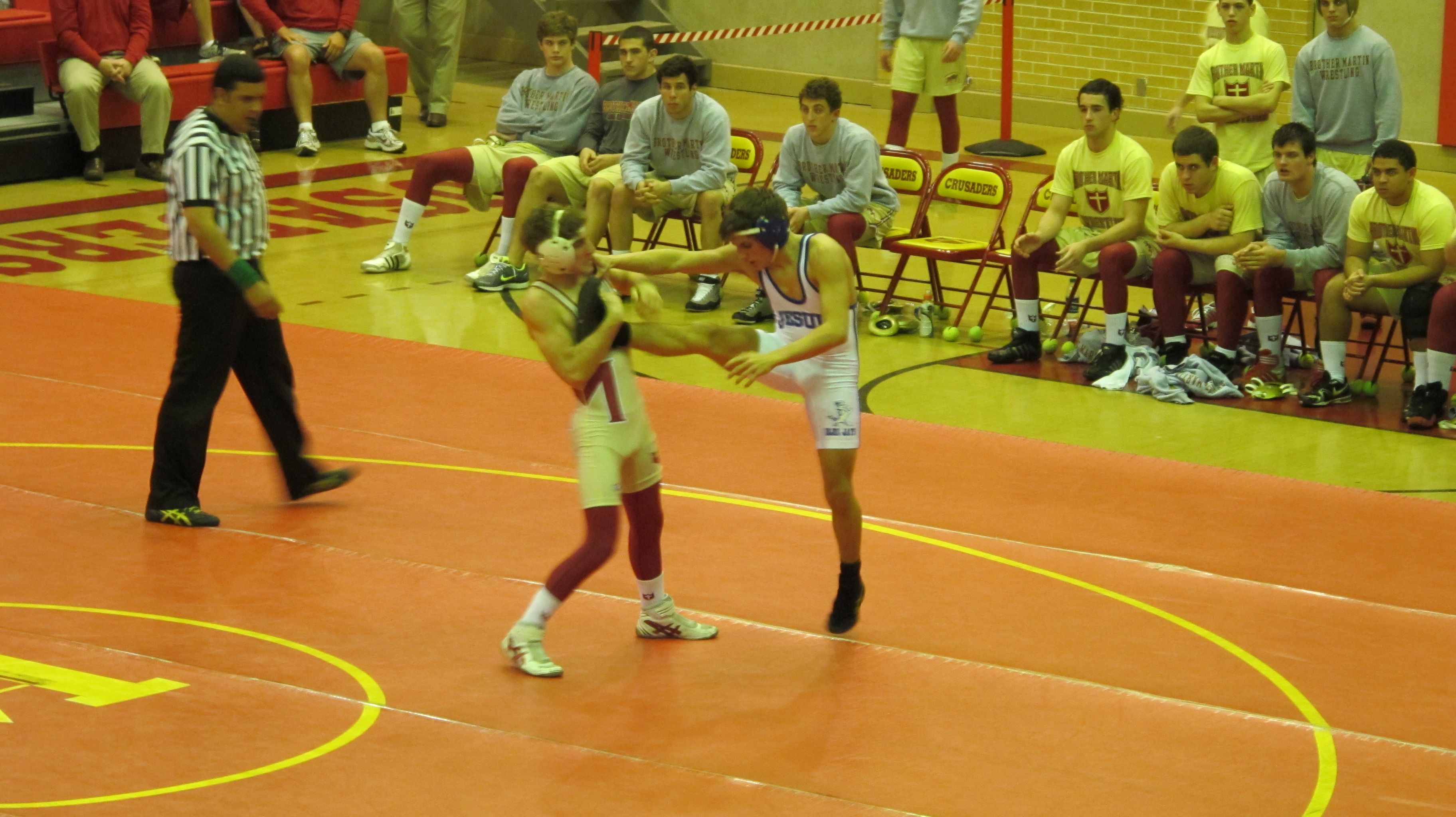 With last night’s victory, the Crusaders are hanging another banner on the wall. Last night, Brother Martin defeated Jesuit by a score of 36-16.  The Conlin Gym was a packed house for this District battle.  Key matches for the Crusaders were the 120 pound, 152 pound, and 195 pound.  In the 120 lb. weight class, Dominic Casadaban scored a fall over Jesuit’s Vincent Bonadona.  Austin Ivicevich upset Jesuit’s Ronnie Hoefeld 10-8 at 152 pounds. Gerard Roman, a defending state champion at 189 pounds, was too much for Jesuit’s Gage Grush at 195 pounds, scoring a technical fall with a 17-2 victory. That defeat pretty much ended any hope of a victory for Jesuit.  Brother Martin won 9 of the 13 matches.