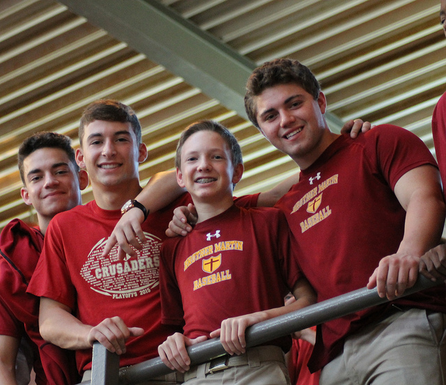 On Friday, September 23, 2016, a Crusader Pep Rally was held in the Conlin Gymnasium. The Student Council unearthed a video that documented the many times that the great ‘Sader stepped in to save the day. He was there at the Boston Tea Party, helping Paul Revere. Next, there was a match up between teachers and students in a game of Dodge ball. The students also dominated to save the extra amazing moves of Mr. Stephen Lewis. Then, the cheerleaders and band pumped up the crowd and got everyone hyped up for the big game against the Patriots.