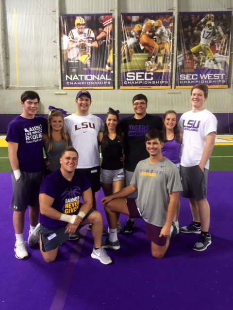Congratulations to past members of the Brother Martin Cheerleaders who attended cheerleader tryouts and made the LSU 2015-2016 Team. Standing L-R: Harrison Trepagnier ’15, Calley Frey, David Trepagnier ’14, Jessie Majorie, Kyle Pecoraro ’14, Elizabeth LeRouge, and Zachary Nelson ’14. Kneeling L-R: Ben Cartner ’12 and Daniel Gegenheimer ’13.