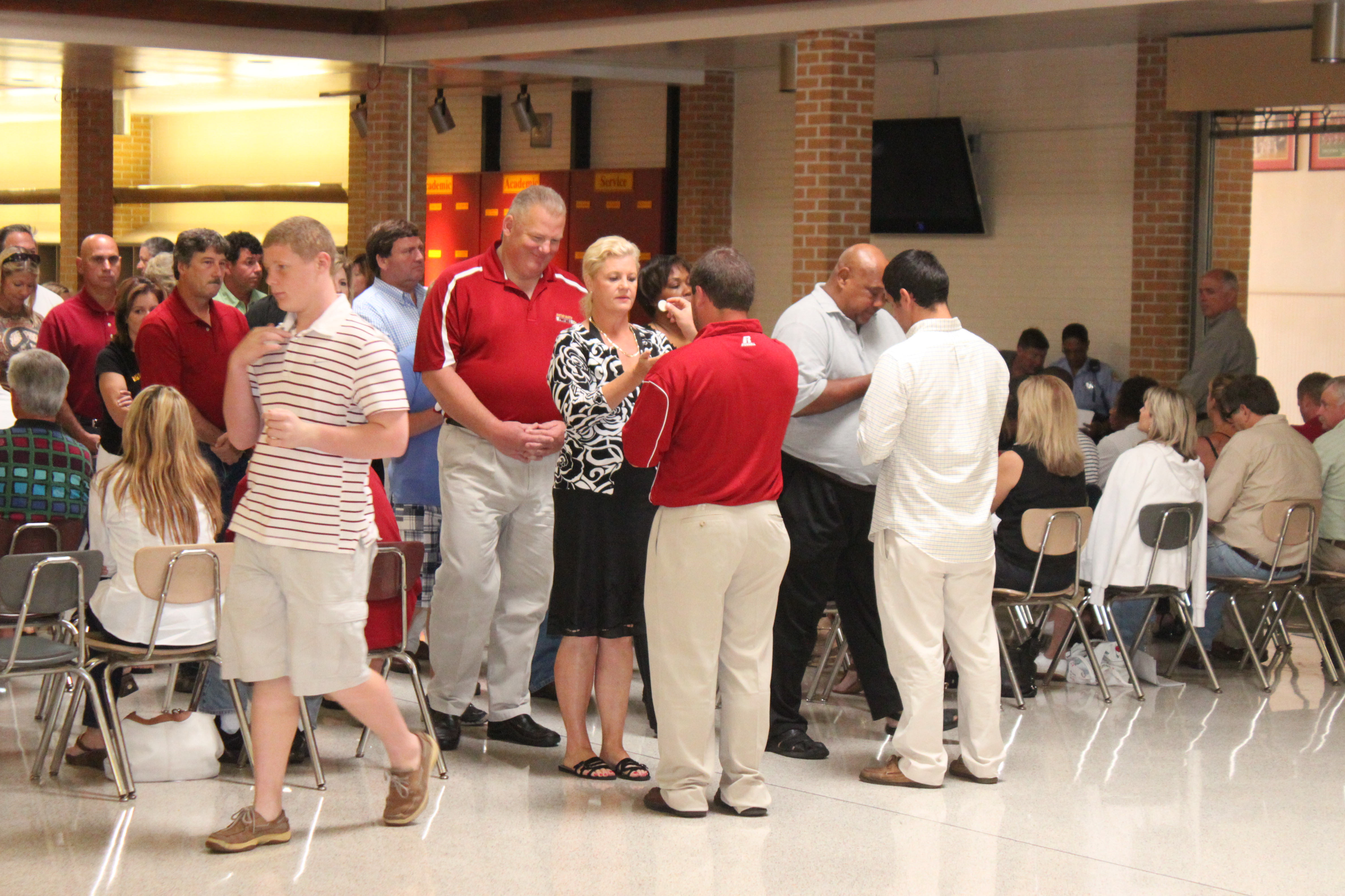 On Saturday the Crusader Football Team shared a special day with their families to ‘kick-off’ the 2012 football season. Head Coach Mark Bonis met with the parents while the players gathered in the Ridgley Center with their position coaches. Following the meetings, Bro. Louis Couvillon, S.C., Ordained Brother of the Sacred Heart, celebrated Mass with the team and their families. Football team members and coaches participated in the Mass as readers and Eucharistic Ministers. Players ended their day with lots of food, family, friends and team photos.