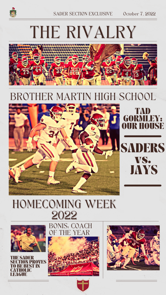The 2022 Brother Martin Homecoming Game versus Jesuit will take place this Friday, October 7th at 7:00 PM at Tad Gormley Stadium. Join us this Friday to show your support for our school, and wear GOLD!
