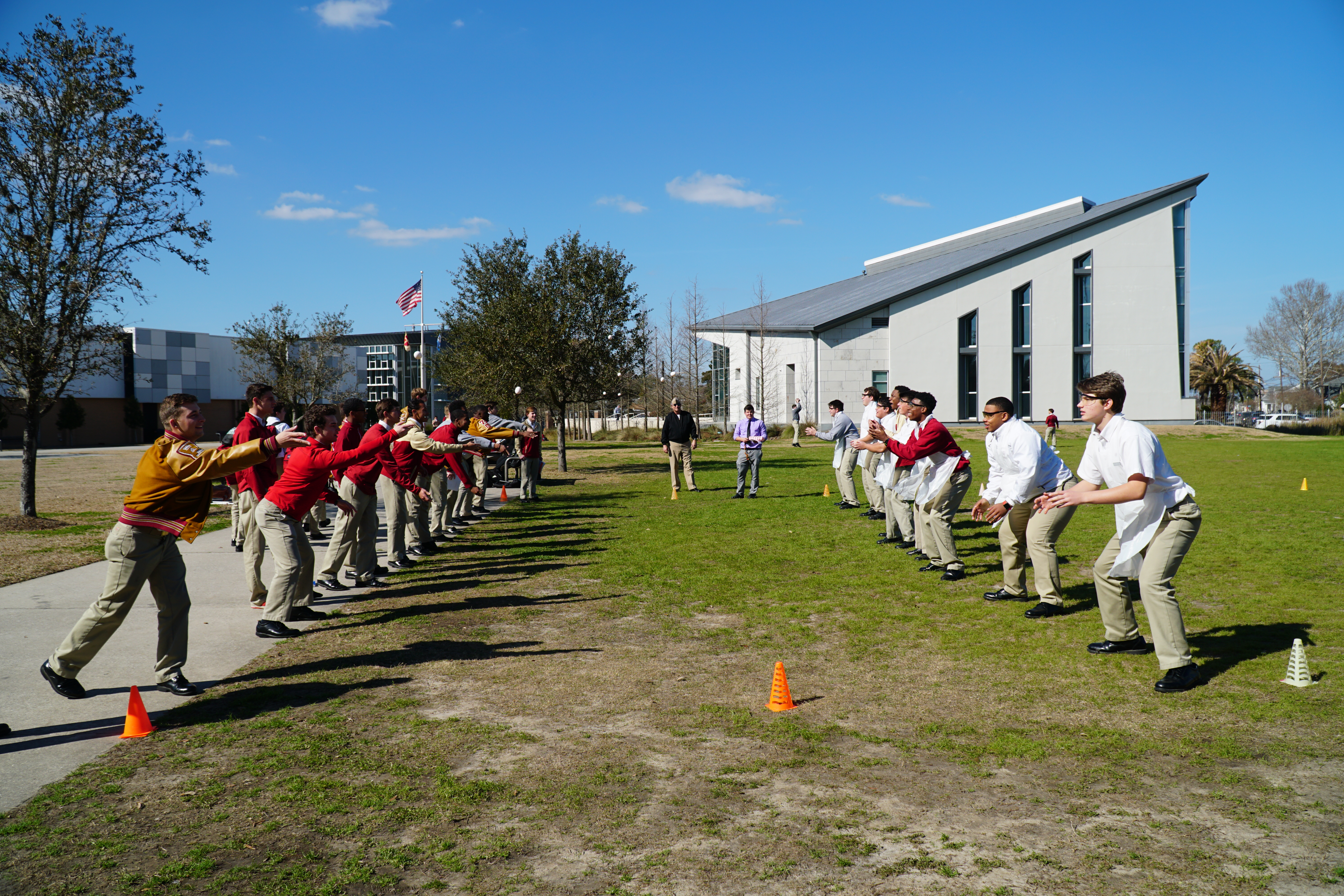 During Mr. Bridgman’s 7th and 8th period physics classes, junior and senior students conducted an outdoor lab experiment in the Backyard of campus. Mr. Bridgman’s students were faced with the challenge of pairing up to conduct the lab “egg toss” experiment and had other students collecting data throughout the process.