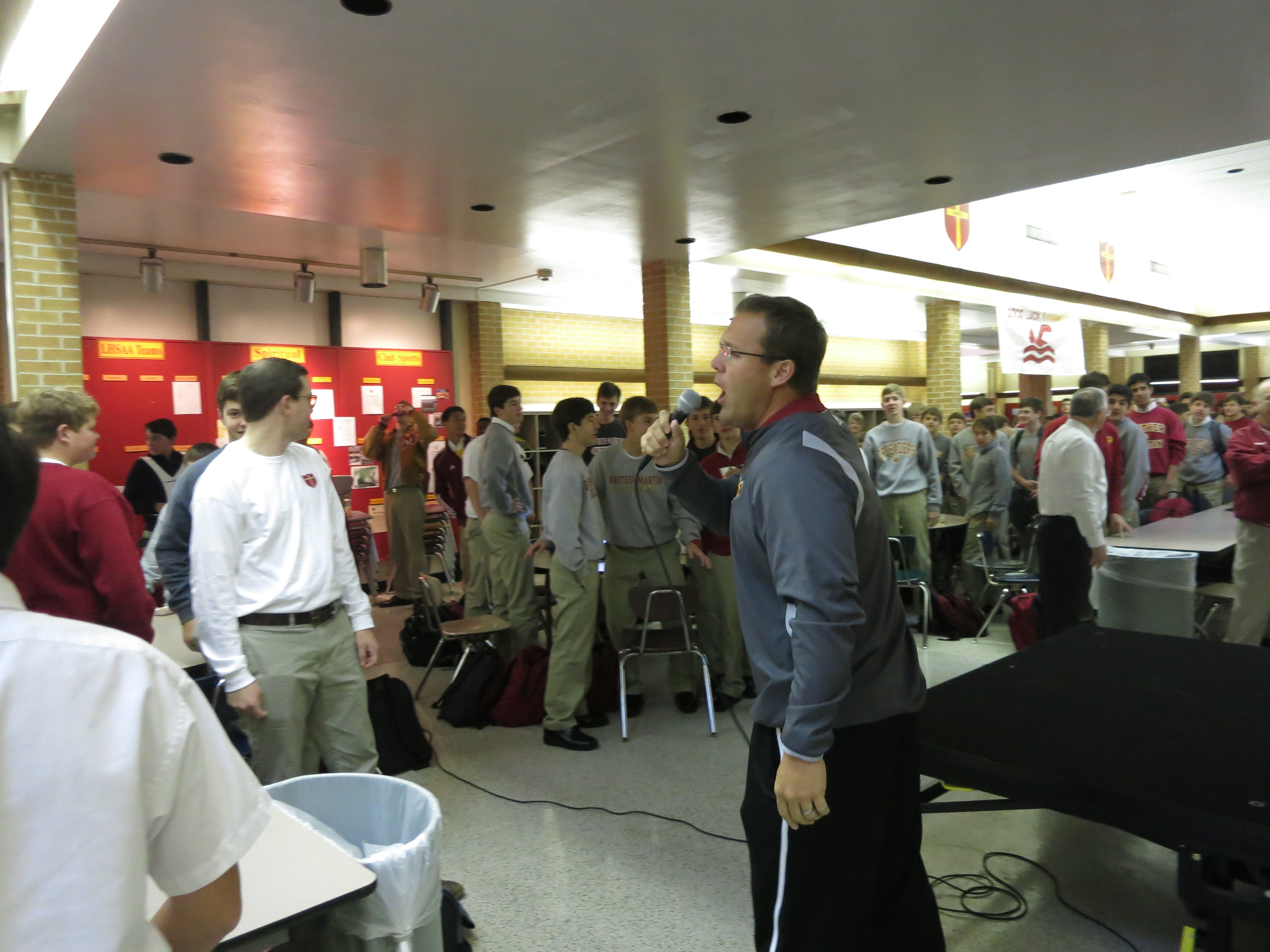 IMG_2427On the morning of one of the biggest football games of the year, the Student Council led a small spirit rally to get the ‘Sader nation excited.  The Benson Mall was rockin’ as the Crusader Band marched the halls of the school and performed Neck and the Crusader Fight Song.  Coach Mark Bonis talked about the significance of this game and led the student body in a cheer.