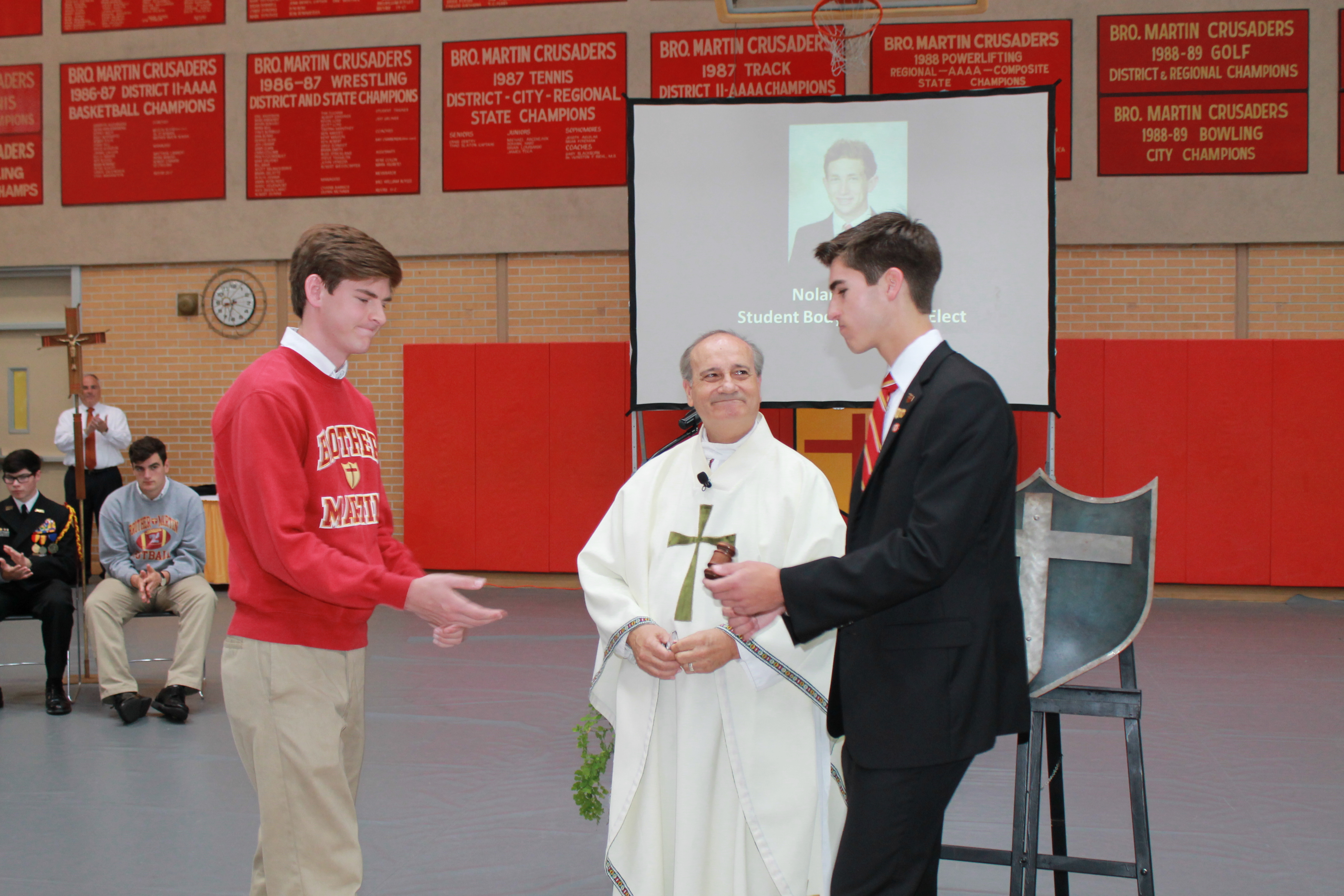 Wednesday morning, the Brother Martin community gathered for its annual Call to Leadership Mass. During his homily, Brother Louis Couvillon, S.C. challenged the junior class to act as role models for the younger Crusaders and lead them by example. Student Council President Michael Maldonado passed the ceremonial gavel onto the newly elected Student Council Vice-President, Patrick Quinn, as a representation of accepting the call to lead the Crusaders. Principal Greg Rando ’77 challenged the students to display caring leadership in all their endeavors. This Liturgy marks the conclusion of the 2013-2014 school year.