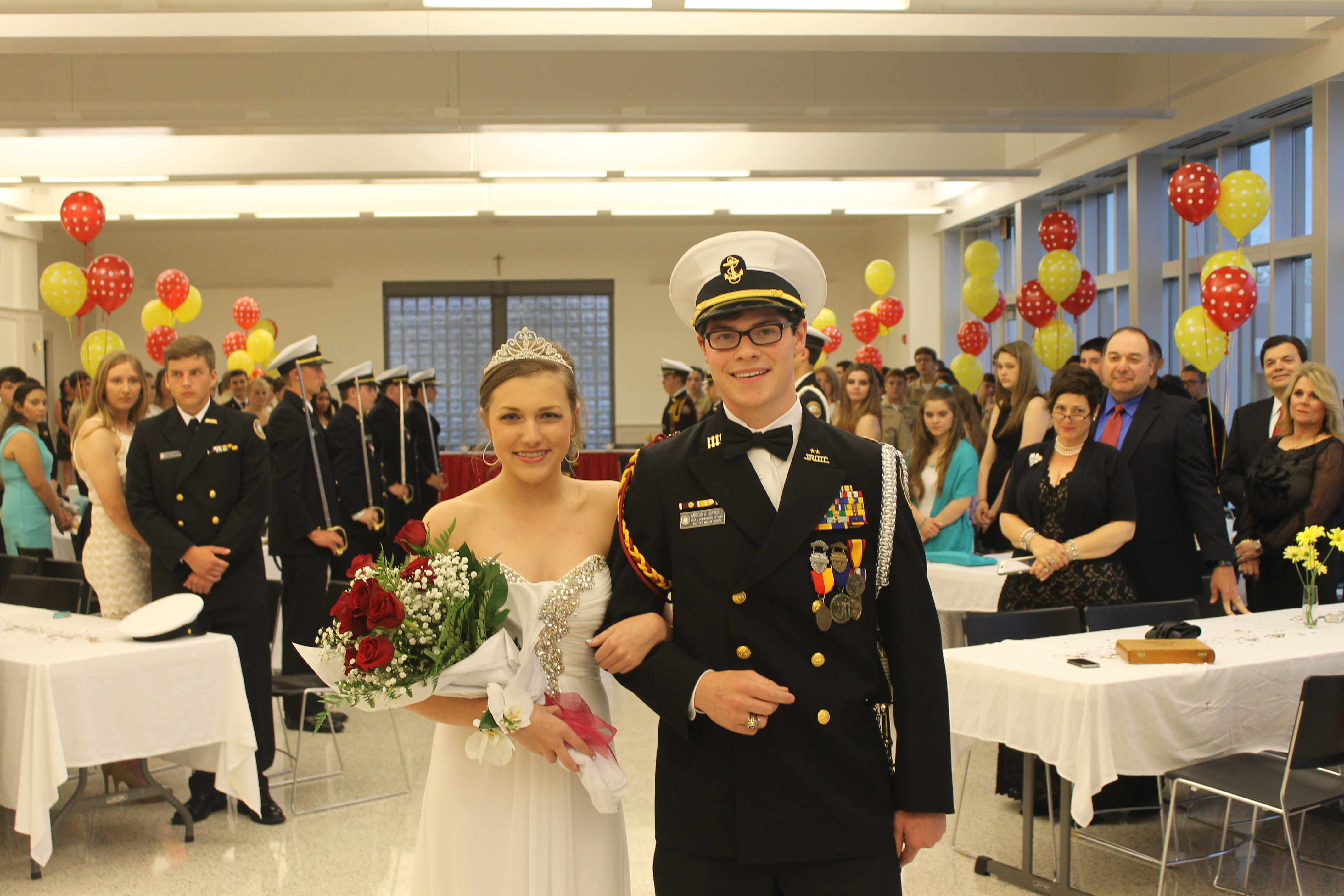 The Brother Martin NJROTC unit celebrated another successful year in a festive way at their annual Military Ball, held in the Brother Mark Thornton Terrace here on campus on Saturday, April 18th. Public Affairs Officer Richard Hunter served as the emcee of the evening, announcing the arrival of the Staff Officers. Led by Cadet LCDR Christopher Breath, a sword arch was formed to formally welcome special guests: Commander Nolan, his wife, and daughter and Chief Necaise and his wife, the Color Guard, under the command of Jacob Detiege, and Cadet Seaman Recruit Pearson Pratt parading the company cake. The unit was then introduced to the 2015 Military Ball Court and Miss Caroline Douglas of Dominican High School (queen), and her court, Miss Erin Chopin, Miss Jamie Hanzo, and Miss Victoria Monzon. Finally, the cadets enjoyed food, fun, and a lot of dancing to end the evening. Thanks to all who helped out for this event!