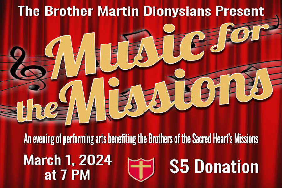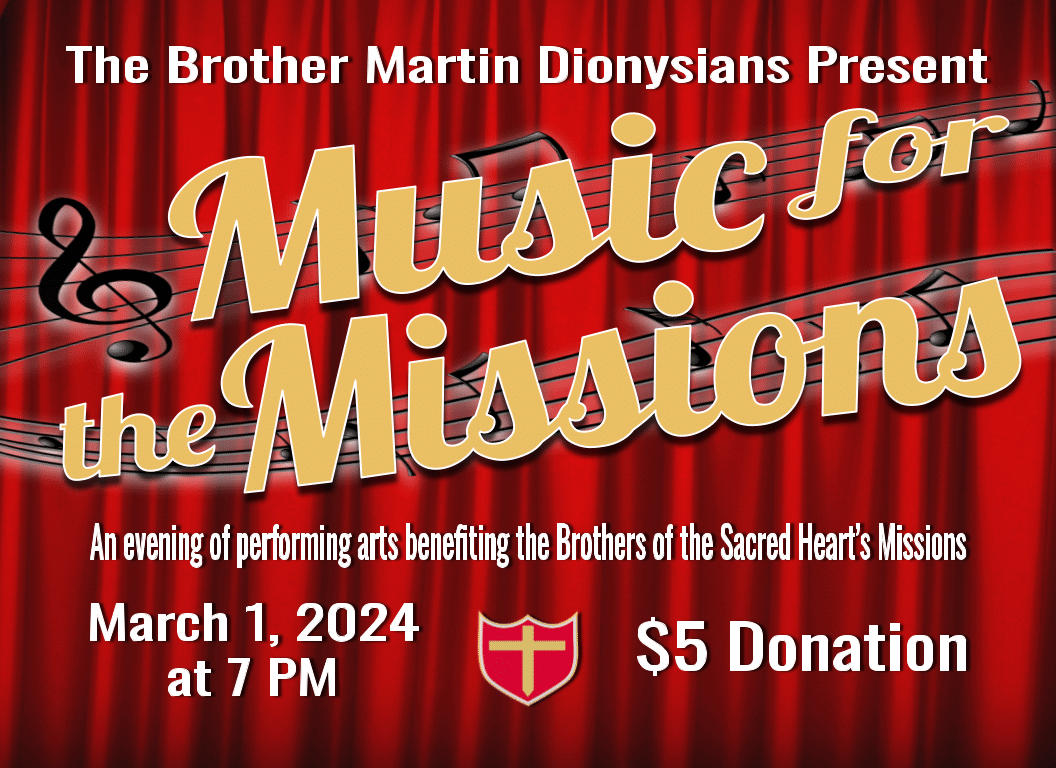 We invite you to join the Brother Martin Dionysians as they perform their annual revue and charity fundraiser, “Music for the Missions,” this Friday in the Auditorium at 7:00 p.m. Tickets are $5 and all proceeds go towards supporting the Brother’s Missions around the world.